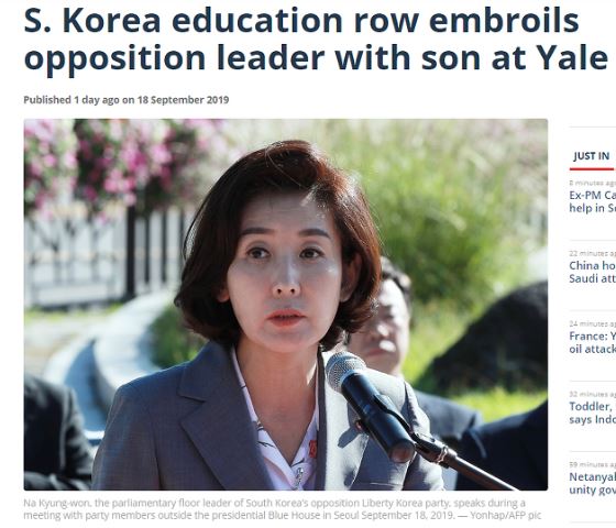 AFP가 '한국 교육 스캔들에 야당 지도자와 예일대 아들이 줄지어 휘말리다'라는 제목의