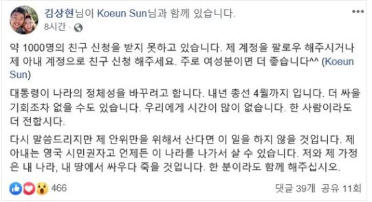 김상현 대표는 24일 자신의 페이스북에 "약 1000명의 친구 신청을 받지 못하고 있다."라고 말하며,